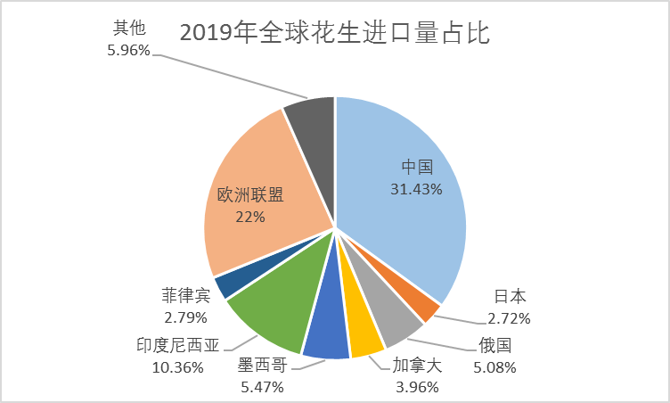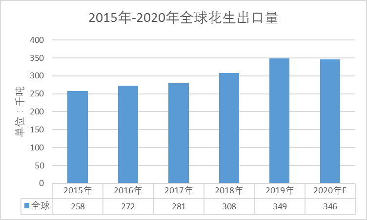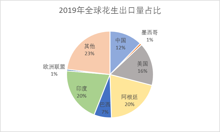 根据美国农业部统计,2015/2016-2020/2021年度全球花生消费量分别为41718千吨、43992千吨、45634千吨、46604千吨、46995千吨及47577千吨。2015年至2020年,中国是花生第一消费大国,每年均占据全球消费50%左右,远远多于其他国家;其次是印度和美国。全球花生前三进口国家分别分中国、欧洲联盟和印度尼西亚,分别占全球花生进口量的26.06%、18.36%和11.34%。此外,花生主要进口国还有墨西哥和俄国。据美国农业部数据显示,2019/2020年全球花生进口总量为4295千吨。其中中国花生进口量为1350千吨(占比31.43%),欧洲联盟花生进口量为945千吨(占比22%),印度尼西亚花生出口量为445千吨(占比10.36%),墨西哥花生进口量为235千吨(占比5.47%),俄国花生进口量为218千吨(占比5.08%)。出口方面,全球花生出口结构与产量结构相比较为分散。2019/2020年来看,印度、阿根廷、美国是全球前三大花生出口国,这三个国家的花生出口量分别占全球花生出口总量的19.983%,19.983%、15.749%。此外,花生主要出口国还有中国和巴西。据美国农业部数据显示,2019年全球花生出口总量为4629千吨。其中印度花生出口量为925千吨(占比19.983%),阿根廷花生出口量为925千吨(占比19.983%),美国花生出口量为729千吨(占比15.749%),中国花生出口量为555千吨(占比11.99%),巴西花生出口量为295千吨(占比6.373%),墨西哥花生出口量为33千吨(占比0.713%)。从国别角度来看,全球花生出口结构与产量结构差异较为明显。中国作为世界最大的花生主产国,但其花生出口量小于印度、阿根廷和美国,位居第四,原因是中国花生主要用于国内消费。