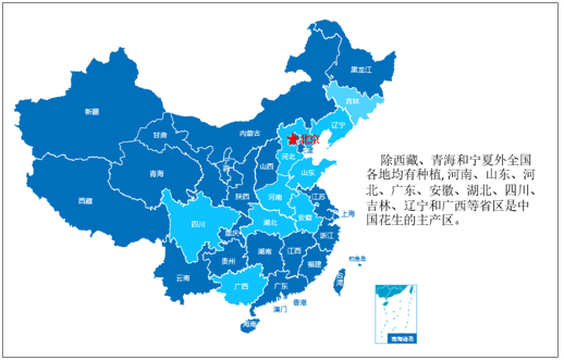 我国花生分布广泛,除西藏、青海、香港外全国各地均有种植。目前,我国花生种植主要分布在华东、华南、华北和华中地区,分别占全国花生总面积的41.8%、28.9%、11%和10%。具体到省份,河南和山东是我国最大的两个花生种植省,种植面积占比分别为25%和15.39%。