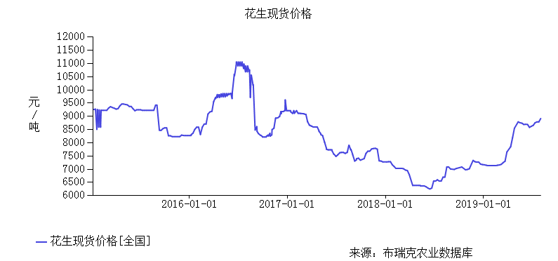 根据农业部数据统计,2015年我国花生价格走高,农民种植花生收益好于其他农产品,种植意愿高涨,加上随着国家供给侧结构改革的推进,我国花生种植面积逐年提升。2017年国内主产区没有受到天气等影响,花生增产丰收,供大于求的基本面下,现货市场价格整体处于大幅下跌状态,销售进度缓慢,导致2018年的花生初期库存远远高于上年同期水平,市场需求淡化,上半年花生现货价格受到高库存行情的压制,价格直线下滑走势,农户种植热情受到影响,进入三季度后,花生产量较上年有所略减,行情逐渐好转,价格重心重新被抬升。