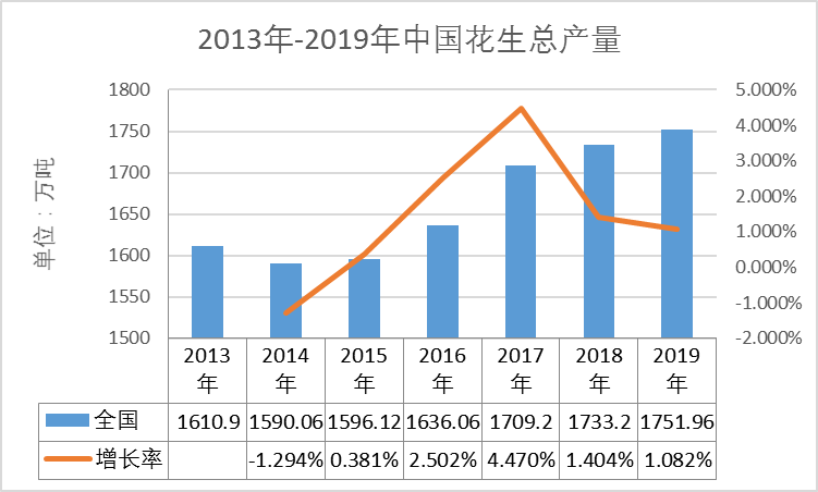 根据农业部数据统计,我国花生种植面积稳中有升,2013/2014年花生播种面积为6594.12万亩;2014年总面积6554.56万亩,同比减少0.60%;2015/2016年总面积 6578.29万亩,同比增加0.36%;2016/2017年总面积6672.62万亩,同比增加1.43%;2017/2018年总面积6911.44万亩,同比增加3.58%;2018年总面积6929.44万亩,同比增加0.26%;2019/2020年总面积6950.23万亩,同比增加0.30%。其中我国河南山东播种面积占比居多,河南五年总面积占比24.91%,山东五年总面积占比15.48%。产量方面,由于农业政策、科技进步和种植效益的推动,中国花生产量持续增加。2019/20年,中国花生总产量1751.96万吨,我国河南省是花生供给第一省份,占比32.92%;其次是山东省占比16.25%,广东省第三,总产量占比6.20% 根据农业部数据统计,2013/2014年总产量1610.9万吨,2014/2015年总产量1590.06万吨,同比增长-1.33%;2015/2016年总产量1596.12万吨,同比增长0.38%;2016/2017年总产量1636.06万吨,同比增长2.44%;2017/2018年总产量1709.2万吨,同比增长4.279%;2018/2019年总产量1733.2万吨,同比增长1.36%;2019/2020年总产量1751.96万吨,同比增长1.07%。