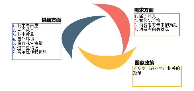 可从供给和需求两种角度出发分析影响花生价格的主要影响因素,并且外界环境因素也影响到花生价格。供给方面:考虑到花生供给的特点,以花生总产量、生产成本、花生质量、自然环境、库存花生余量、进口量情况和竞争性作物价格等几个角度分析花生价格的影响因数。花生总产量是花生供给量的重要组成部分,总产量的下降造成花生市场供给量减少,从而导致供不应求,花生仁价格上升;而总产量增加则使花生市场供给量大于需求量,花生仁价格明显下降。而大多数商品的价格上升,都是受到生产成本的上升影响,花生作为农产品也不例外,其价格受到生产成本的高低所影响。在自然环境方面,花生生长过程中受到灾害,在最后收获的季节,总产量比正常年份的收成减少。库存余量方面,花生是可以存储很久的,不是一定要新鲜。若还有前几年的陈年花生还在库存中,今年依旧可以出售,从而影响花生价格。进口量方面,我国是进口量大国,但是对比产量,绝对数值不高。2019/2020年进中国花生进口将达到创纪录的近 140万吨,占到全球花生贸易的三分之一。中国首次成为最大的进口市场,比欧盟进口量高出40%以上。需求方面:考虑居民收入、替代品价格、消费者对未来的预期、消费者自身状况作为花生需求对价格的主要影响因素。随着居民消费能力的提升,对花生及其深加工产品的支付能力增强,间接刺激消费拉动需求,人民的收入水平对花生食品的消费市场具有弹性的,从而对花生价格的波动产生一定的影响。从油料作物的角度,大豆油作为花生油的替代品,考虑大豆油价格对花生价格波动的影响。国家政策方面:国家政策既影响花生的供给也影响花生的需求。国家通过对农户进行直接补贴的方式鼓励花生的生产、提高花生农户的收入,达到刺激农民积极性、增加花生等油料作物的种植面积的目的,进而增加油料作物的供给。