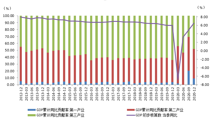 1.四季度GDP超预期增长,经济持续走好。四季度国内GDP增速达到6.5%,环比三季度GDP再度回升1.6个百分点,超过预期值6.1%,全年GDP增速2.3%,中国预计成为全球唯一一个正增长的主要经济体。主要支撑因素有以下两点:一是出口的强力支撑。按美元计价,2020年全年我国进出口总值4.65万亿美元,同比增长1.5%,出口同比增长3.6%。12月,进出口同比增长12.9%,出口同比18.1%,继续维持高增速增长。随着疫情反弹,防疫物资出口量稳定,叠加外需的持续修复,出口仍将持续处于高位,对GDP起着抬升作用。二是房地产维持高景气。第四季度房地产销售面积较三季度进一步扩大,增速由10.14%提升至12.93%。在疫情期间,政府采取逆周期宏观政策扶持经济,促使地产行业蓬勃发展,但随着疫情影响的褪去,地产行业或将面临调控压力。总体来看,四季度GDP与我们之前预估的6.9%(5.17%与8.71%的均值)接近,说明随着疫情影响逐渐褪去,我国经济与预期一般持续复苏,叠加基数效应,预计2021年经济将继续向好,一二季度GDP将达两位数高增长。