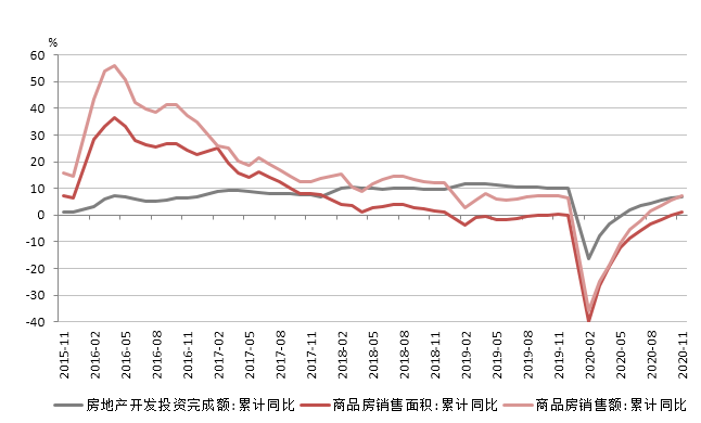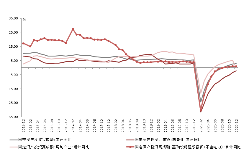 3. 固投增速持续回升,结构继续优化。1-12月份,全国固定资产投资同比增长2.9%,增速比1-11月份提高1.0个百分点。基础设施投资比上年增长0.9%,环比小幅回落0.1个百分点;房地产开发投资显著增长7.0%,增速进一步上升;制造业降幅进一步收窄至2.2%。地产虽受到政策调控压力,仍维持着两位数的高增长,保持韧性。基建继续回落,不及预期。由于优质项目的缺乏,12月基建投资增速较上月回落1.5个百分点,拉低整体投资增速。2021年由于专项债提前批下达的可能性较低,预计基建增速将不及预期。制造业表现亮眼,自8月份以来快速增长。值得关注的是,高技术产业投资增长10.6%,快于全部投资7.7个百分点,体现了固投结构的进一步优化,由传统产业向高科技产业逐步优化。总体来看,12月份国民经济保持稳步复苏态势,“六稳”“六保”政策效果显著,固投增速保持增长。预计1月份经济回升将继续加快,固定资产投资将持续上升,地产由于监管政策有下行压力,基建仍将不及预期,制造业将会是2021年关注重点。