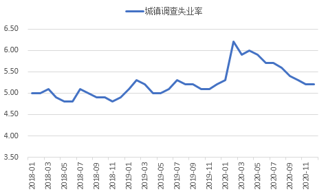 5. 就业形势总体稳定,城镇调查失业率回落至上年水平。12月份,全国城镇调查失业率为5.2%。2020年年均城镇调查失业率为5.6%,低于6%左右的预期目标。整体来看,就业形势维持稳定,城镇调查失业率回落至上年水平。全年来看,城镇新增就业1186万人,高于900万预期,完成全年目标的131.8%,超额完成。显示自疫情以来,我国经济不断修复,从居家隔离快速过渡到复工复产,疫情持续期间的就业问题得到大幅度改善。后续随着经济进一步复苏,市场用工需求有望持续上升。尽管当前就业数据逐月改善,但仍有一定的改善空间,预计下一阶段稳就业仍将是就业政策的重点。
