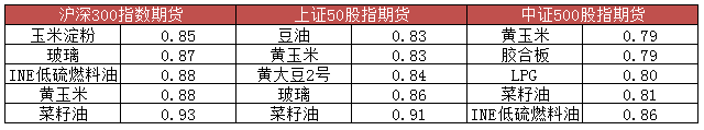发现菜籽油(OI)与沪深300(IF)的正相关系数最大,为0.9288;其次为菜籽油(OI)与上证50(IH),为0.9074;排第三为玉米(C)与沪深300(IF),为0.8847。