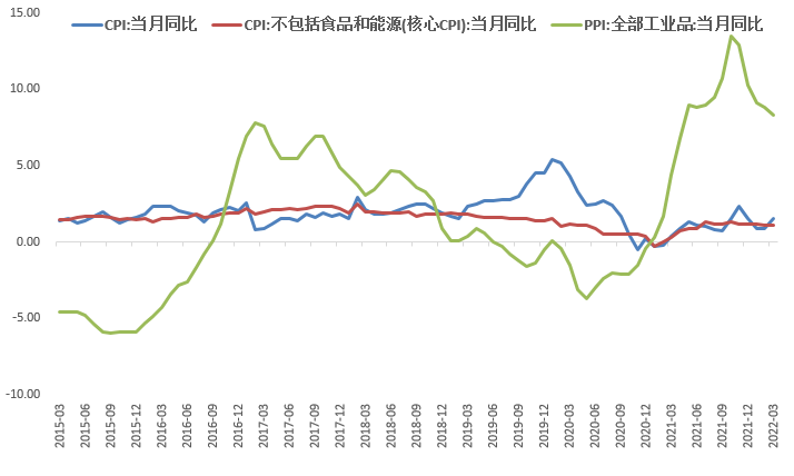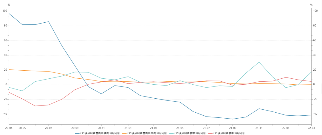 从食品项看,3月食品价格同比下降1.5%,降幅比上月收窄2.4个百分点,影响CPI下降约0.28个百分点;环比由上涨1.4%转为下降1.2%,影响CPI下降约0.22个百分点。节后需求回落,供需错位价格下行。3月份猪肉价格同比下降41.4%,降幅比上月缩窄1.1个百分点;环比价格继续回落9.3%。从供给端看,生猪出栏速度的持续加快导致猪肉供应依旧较为充足。从需求端看,目前猪肉已进入需求淡季,消费需求持续回落,需求始终不及产出。目前来看,全国猪肉价格近期连续走低,3月下旬批发价格已经跌破20元/公斤,3月全国猪肉平均批发价在18元/公斤上下浮动,比上个月下降近6个百分点。在供需错位的背景下,猪肉价格或将继续位于下行区间。食品中除猪肉外,其余食品价格表现分化,畜肉业价格均有不同程度下跌,而豆类相关食品价格有所上涨。鸡肉、鸭肉、牛肉、羊肉价格降幅在1.0%—2.3%之间;而受国际小麦、玉米和大豆等价格上涨及国内疫情影响囤货需求,面粉、食用植物油、鲜菜和鸡蛋价格分别上涨1.7%、0.6%、0.4%和0.3%。接下来,由于我国是粮食供给大国,国内粮价持续受输入型通胀影响的可能性不大,叠加季节性影响食品需求,环比价格或有所下行。需注意疫情反复。从非食品项看,3月非食品价格同比上涨2.2%,涨幅较上月扩大0.1个百分点,影响CPI上涨约1.77个百分点;环比由上涨0.4%缩小为0.3%。其中,工业消费品价格由持平转为上涨1.1%,,涨幅比上月扩大0.3个百分点,汽油、柴油和液化石油气价格受国际原油价格拉升影响分别上涨7.2%、7.8%和6.9%;此外,服务价格由上月持平转为下降0.2%。其中,节后需求回落叠加疫情影响,飞机票、电影及演出票、交通工具租赁费和旅游价格分别下降10.0%、7.6%、3.5%和2.6%。剔除食品和能源后,反映终端消费需求的核心CPI同比增速1.1%,与上月相同,反映总体通胀水平继续保持温和稳定。总体来看,接下来我国居民消费价格或将面临一定上涨压力。受俄乌局势升级影响,玉米、大豆、原油、贵金属等多种商品价格仍在上调,从而影响相关行业中下游,例如玉米、大豆价格推动饲料、食用植物油等产品价格上涨、原油价格推动居民通勤成本以及交通运输成本等。