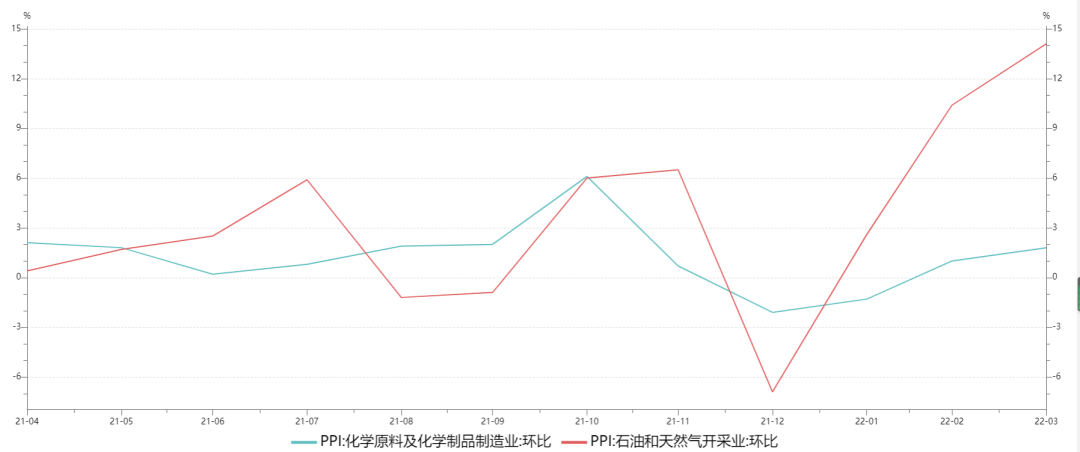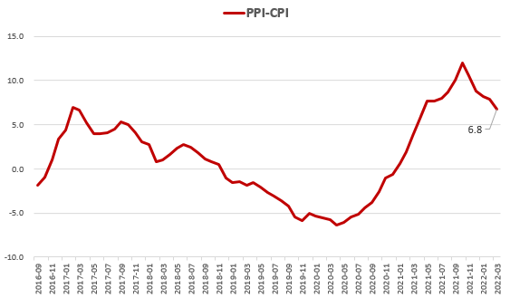 受原油、有色金属等国际大宗商品价格上涨等因素影响,工业品价格环比涨幅继续上升;但受去年同期基数走高影响,同比涨幅小幅回落。3月PPI同比上涨8.3%,涨幅比上月缩窄0.5个百分点;环比上涨0.5%,涨幅较上月上升0.5个百分点。其中,生产资料价格环比上涨1.4%,进一步扩大0.7%;生活资料价格由上涨0.2%,小幅上涨0.1%。地缘政治原因影响大宗商品价格上涨,进而推动3月PPI环比持续高涨。并且从生产资料与生活资料价格环比增速可以看出,上游成本涨价压力在向中下游企业传导,且趋势仍在延续。从同比增速来看,生产资料与生活资料价格同比分别增长10.7%和0.9%,剪刀差进一步缩窄0.7个百分点,中下游企业经营压力继续加大。此外,上海疫情态势严重,累计确诊数已破万,全国消费持续受疫情影响,表现不佳,从而使得与中下游消费相挂钩的生活资料价格表现较为疲弱。主要行业中,国际原油、有色金属价格冲高带动国内相关行业价格。石油和天然气开采业价格上涨14.1%,石油煤炭及其他燃料加工业价格上涨7.9%;有色金属冶炼和压延加工业价格上涨2.7%。本月国际原油走高,仍然是是受地缘政治等因素导致。近期俄乌冲突再度升级,俄乌之间多轮谈判均未取得显著突破,叠加欧美制裁措施不断加码,接下来,地缘政治因素不确定性依旧较大,俄乌形势十分严峻,大宗商品价格或继续走高。若俄乌两国冲突得不到解决,并且欧美针对俄罗斯的打击措施延续,那么由于俄罗斯是原有生产大国,全球原油供给可能会维持紧张台式,从而将油价维持在较高区间,未来两个月PPI涨幅大概率将会扩大。需要注意的是,中小企业经营压力增加趋势仍在延续。