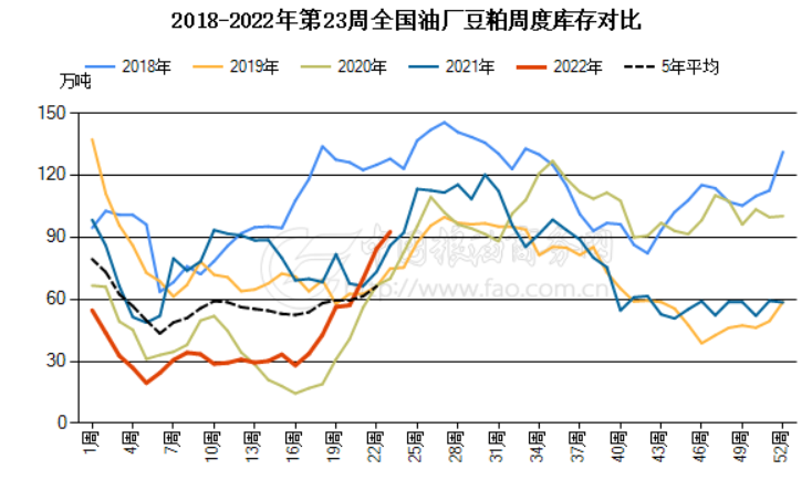 从国内的情况来看,近期油厂的压榨利润表现不佳,虽然豆油以及豆粕都有一定的累库的迹象,但是豆粕的胀库压力明显更大,且在豆粕存放时间有限的影响下,油厂更偏向于挺油价卖豆粕的操作,对豆油的价格有所支撑。从豆粕的库存来看,大豆压榨量回落,豆粕产出减少,但饲料养殖企业提货速度缓慢,豆粕库存继续上升。6 月 6 日,国内主要油厂豆粕库存 92万吨,比上周同期增加 7 万吨,比上月同期增加 36 万吨,比上年同期增加 6 万吨,比过去三年同期均值增加 19 万吨。随着豆粕库存持续累积,部分油厂出货压力较大。挺油卖粕的操作加大。