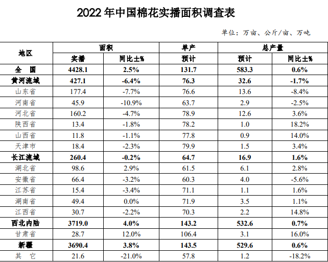 USDA周度作物生长报告显示,截至6月12日当周,美国棉花种植率为90%,之前一周为84%,去年同期为87%,上周为84%;优良率为46%,之前一周为48%,去年同期为45%;现蕾率为14%,之前一周为11%,去年同期为12%。虽然在经历多轮降雨后,美国棉花种植进度及生长情况好于2021年同期,且6月报告并未调整美国棉花弃耕率,美棉数据相对变化不大。近日2022年棉花播种面积公布,数据利空棉市。国内棉花扩种预期增加,加之今年新疆天气适宜,长势较好,预计2022年度棉花增产预期。2022 年 5 月下旬,国家棉花市场监测系统对新年度的棉花播种调研报告发布,调查结果显示,2022年全国棉花实播面积4428.1万亩,同比增加109.1万亩,增幅2.5%。其中,新疆棉花实播面积为3690.4万亩,同比增加134.4万亩,增幅3.8%。新疆棉实播面积稳中有增,首先是国家继续深化执行目标价格补贴政策,再者是2021年度新疆籽棉收购价格创11年来新高,棉花种植收益明显增加,棉农植棉季节性提升;另外是随着新疆棉花机械化生产率提高,播种面积进一步增加。财政部、农业农村部近日发布2022年重点强农惠农政策知晓,将九省棉区棉花制种大县纳入奖励范围,提高农作物良种覆盖面,提升核心种源保障能力,促进种业转型升级,实现高质量发展,预计未来内地棉花种植率稳中提升发展。