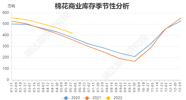 工业库存方面:由于棉花现货价格下跌,纺织企业利润有所改善,成品库存也有一定程度的降低,采购意向有所好转,原料库存稳中略增。截至5月31日,纺织企业在库棉花工业库存量为59.01万吨,较上月底增加0.58万吨,同比减少27.23万吨。其中:42%的企业减少棉花库存,18%增加库存,40%基本保持不变。商业库存方面,截至5月底棉花商业库存为416.28万吨,环比减少49.9万吨,同比增加58.49万吨。从数据可以看出,环比数据虽有所下滑,但目前商业库存仍处于近五年最高值,且5月的同比增幅数据仍然呈现上升的趋势,棉花供应仍显宽松局面。