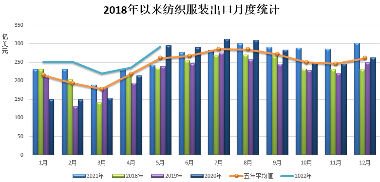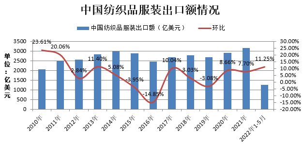 海关总署最新数据显示,2022年5月纺织品服装出口292.27亿美元,环比增加23.89%,同比增幅20.36%。2022年1-5月我国纺织品服装出口累计值为1250.7亿美元,累计增幅为11.25%,其中,纺织品出口628.5亿美元,同比增长12.1%;服装出口622.2亿美元,同比增长10.2%。5月纺织服装出口同比增长好于预期,得益于4月底国家出台一系列稳经济外贸政策落地,加之国内疫情形势好转,全国物流运输得到恢复,出口需求转好。不过行业面临的外贸形势依然复杂,各机构对2022年全球经济贸易增长预期下调,加之东南亚国家纺织供应链持续恢复,对欧美等市场出口增长迅速,预计下半年我国纺织行业出口贸易仍面临较大的竞争压力和不稳定因素。