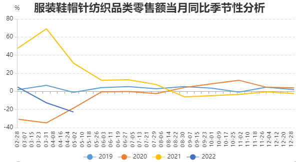 国内服装零售:在原料成本上升带动终端产品价格上涨的背景下,国内服装零售需求疲软,纱线等市场维持弱势,加之新增订单匮乏,产成品累库,下游需求旺季不旺态势仍未改善。据国家统计局,截至2022年5月,国内服装鞋帽、针、纺织品类零售额为958亿元,同比减少16.2%,2022年1-5月国内零售服装鞋帽、针、纺织品类零售额累计为5093.0亿元,同比减少8.1%。2022年1-5月国内服装类零售额累计同比减幅扩大,国内服装类零售额表现显示疲软。