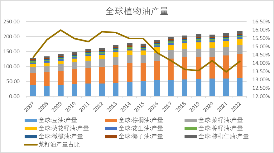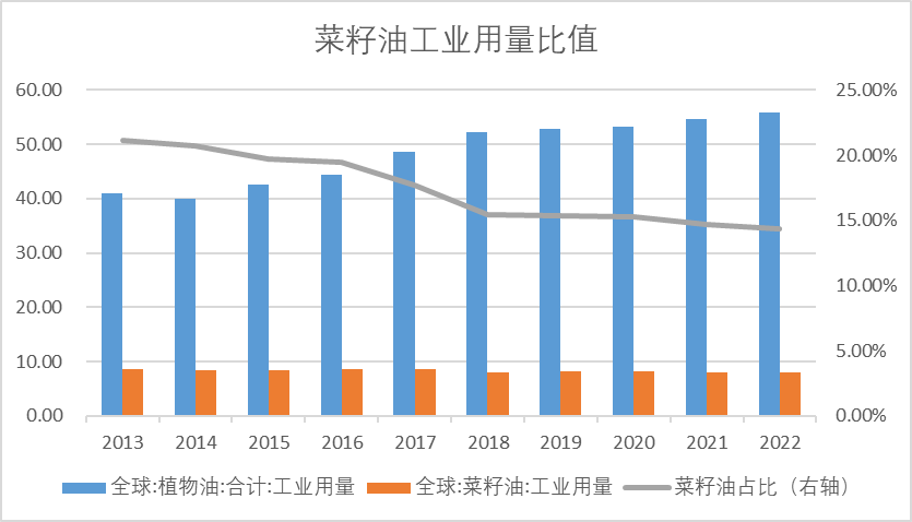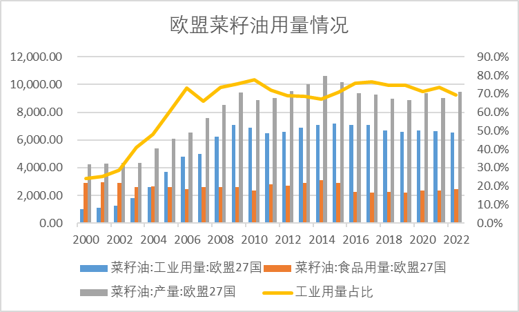 从期货指数价格数据来看,近年来我国植物油价格与国际原油价格的相关性表现得越来越高。据wind统计显示,近五年,郑商所菜油期货价格指数与ICE WTI原油指数相关性为0.56,大商所棕榈油和豆油价格指数与ICE WTI原油指数相关性为0.823和0.79;近三年,郑商所菜油期货价格指数与ICE WTI原油指数相关性为0.821,大商所棕榈油和豆油价格指数与ICE WTI原油指数相关性为0.912和0.908;近一年,郑商所菜油期货价格指数与ICE WTI原油指数相关性为0.805,大商所棕榈油和豆油价格指数与ICE WTI原油指数相关性为0.933和0.938。从以上数据来看,各植物油品种间相关性不尽相同,豆棕油与原油的相关性高达0.9以上,而菜油与原油相关性在0.8左右,不同植物油与原油之间相关性存在差异的主要原因在于各品种植物油的产地、产量及各国的使用方面存在些微的差距。本文将侧重分析国际原油与菜油价格之间的关联性。国际原油与植物油价格表现出高度相关性,离不开全球生物柴油的迅猛发展。随着能源危机、环保理念的不断深入,世界各国积极寻找可替代石油的新能源。而大力发展生物柴油对经济可持续发展、推进能源替代、减轻环境压力、控制城市大气污染具有重要的战略意义。故而,近年来各国对生物柴油的投入不断加大,生物柴油产量出现井喷式增长。据wind数据显示,2001年全球生物柴油产量为10亿升,2010年为185亿升,2020年增加到393亿升。因稳定的原料供给差异,世界各生物柴油主产国的原料使用有所不同,美国、巴西和阿根廷利用豆油生产生物柴油,印尼利用棕榈油生产生物柴油,而欧盟生物柴油的主要原料为菜籽油。正因为目前植物油是生物柴油的主要原材料,所以随着生物柴油产量的大幅增加,使得植物油需求同步递增。据美国农业部(以下简称USDA)数据显示,全球植物油工业用量占比从2000年的11%,逐步增加至目前的26.3%。工业用量的大幅增加,使得原油与植物油的关联性也越来越紧密。从植物油产量来看,USDA数据显示,全球植物油产量呈现逐年递增的模式,其中各品种产量增幅较大的是豆油、棕榈油及葵花籽油,因葵花籽油产量基数相对而言较小,这里暂且不做考虑。2012年-2022年时间区域里,豆油产量由4310万吨增加至6151万吨,棕榈油产量由5638万吨增加至7914万吨。而菜籽油产量仅从2568万吨,微增至3074万吨,产量增幅相对较小,故而豆棕油产量大幅增加削弱了菜籽油在植物油中所占的比重。从菜籽油单个品种来看,随着生物柴油的大力发展,全球植物油工业用量从2013年的4093万吨增加至目前的5590万吨,增幅达36.6%。然而在此期间,全球菜籽油工业用量却从864万吨降至801万吨,其中缘由一方面是原料主产地,另一方面更为主要的因素在于生产成本。菜籽油价格相对于豆棕油较高,在生产成本与效用综合衡量而言,大部分国家在选择上是倾向于豆棕油的。菜籽油工业用量比重也由2013年的21.1%下降至目前的14.3%,这也表明菜油与原油的直接关联度是递减的。自《京都议定书》后,欧盟加紧落实碳减排问题,大力发展可再生能源。据经合组织农业展望数据显示,欧盟是世界上最大的生物柴油生产主体,2006年生物柴油产量为594万吨,占全球总产量的70.5%,2011年生物柴油产量为1035万吨,占全球总产量的41.7%,2021年产量增加至1514万吨,占全球总产量的31.4%。因欧盟生柴主要原料为菜籽油,故而随着欧盟生物柴油产量的增加,对菜籽油需求有所保障。从欧盟菜籽油供需情况来看,据USDA数据显示,自2008年以来,欧盟菜籽油产量基本维持在880-1000万吨,工业用量也保持在620-720万吨,工业用量平均占比高达72%左右。同时,对比全球菜籽油工业用量总量来看,欧盟占比在80%以上,所以欧盟对于生物柴油的政策对菜籽油需求起着至关重要的作用。2014年《可预见的能源和气候目标框架》强调可再生能源有助于交通运输部门应对碳减排的挑战,重点放在电动汽车和非粮食作物生物柴油生产;2015年《生物柴油调和燃料B20 B30标准》欧盟允许在柴油中添加20%—30%的生物柴油;2018年《可再生能源指令(第二版)》2030年可再生能源消费比例达到32%,其中可再生燃料在运输部门的占比达到14%;2021年《可再生能源指令(第二版)修订》2030年可再生能源消费比例达到40%,其中可再生燃料在运输部门的占比达到26%。从政策导向不难看出,欧盟可再生能源的消费需求只增不减,但是从细分的要求来看,植物油原料生柴掺混上限将从2021年的7%下降到2030年的3.8%,第二代生物燃料掺混下限将从2021年的1.5%上升到2030年的6.8%,非食物为原料的先进生物燃料UCOME在 2030 年要求比例为1.7%。第二代生物燃料及非食物原料才是欧盟今后大力发展的方向,而植物油占比将逐步被削弱,所以菜籽油需求量并不会继续增加,这一点也可以从近年来欧盟菜籽油工业用量的数据中得以证实,这将导致菜籽油与原油的直接关联性进一步降低。综合来看,菜籽油作为欧盟生物柴油的主要原料,成为其与原油价格之间直接关系的纽带。然而由于欧盟政策导向以及其他竞品的发展,使得两者之间的直接关系逐步减弱。不过,豆棕作为其他国家生柴的主要原料,使得植物油市场整体工业需求逐步增加,植物油与原油之间的关系越来越紧密,从而通过二次传导,间接的增强菜籽油与原油之间的关联度。这也刚好证明了开篇中提到的数据,豆棕油与原油相关系数明显高于菜籽油。在世界各国找到更加优