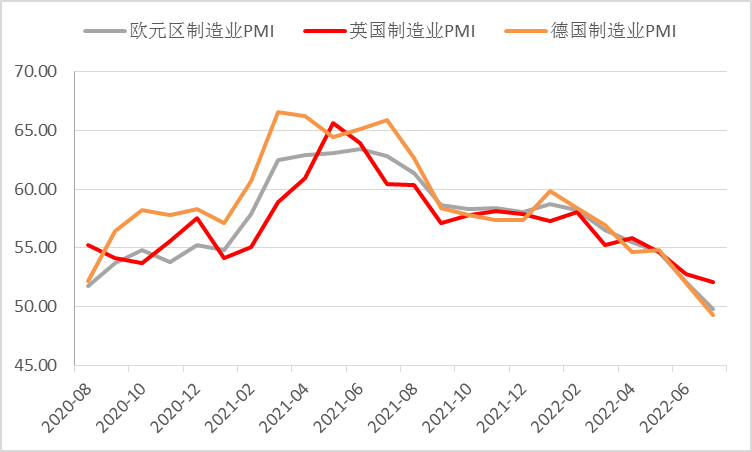 图 4 欧元区及德国PMI指数均降至50%荣枯线下