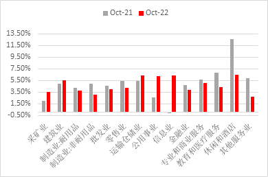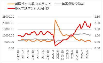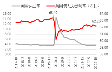 美国10月新增非农就业人数录得26.1万人,10月新增就业人数虽为2020年12月后的最小增幅,但仍远超预期的20.5万人,整体放缓趋势逐渐淡化。细分行业来看,服务业在10月仍为新增就业人数的主力推手,其中教育和保健服务新增7.9万人,专业和商业服务新增3.9万人,休闲和酒店业新增3.5万人。失业率在10月意外上涨至3.7%,高于预期的3.6%及前值3.5%。然而尽管失业率意外回升,但先前市场较关注的劳动参与率却下调至62.20%,延续了先前的下滑趋势。尽管失业率有所上升,但当前劳动参与率与疫情前63.4%的水平仍有较大的差距,其中55岁以上的劳动力参与率恢复速度遭遇瓶颈,同时25至54岁的劳动力人口参与率也有所下滑。劳动力市场供给整体恢复进度的放缓或继续给予薪资端压力,同时25至54岁的劳动力人口参与率恢复空间有限,供给端紧张的状况或在年底前难以大幅好转。薪资增速方面,10月非农平均时薪环比增速录得0.37%,较前值0.31%再次上升且为连续第二个月上升,但同比增速放缓至4.73%,较前值4.98%再次回落的同时也是连续第3个月下降。细分行业来看,专业和商业服务(0.49%)、教育和医疗服务(0.25%)、休闲和酒店(0.54%)及其他服务业(0.45%)的环比薪资增幅在本月皆有所扩大,印证了服务业招聘供不应求的现状。然而从同比层面来看,整体服务业薪资同比增速在今年10月较去年同期已有所放缓。9月公布的职位空缺数录得1071.7万人,较前值激增43万人,而失业人数则录得546万人,职位空缺数与失业人数的比例为1.96,较前值1.64大幅提升。细分行业来看,服务业中专业和商业服务、教育和保健服务及休闲住宿业总体职位空缺数与前两个月相比不减反增,总体需求水平并未呈现明显下滑。然而10月超预期的非农新增就业人数或使整体职位空缺下降,同时失业人数的上升或为劳动力市场提供一定的供给,整体供需水平在明年年初或逐渐平衡,但年底前劳动力市场紧张的现象受制于整体参与率瓶颈及需求缺口较大的情况下或难以大幅好转。本次超预期的非农就业数据体现总体劳动力市场需求仍就旺盛,即便失业率在本月再次上涨,但劳动力参与率的下滑在当下供需失衡的就业市场或更值得投资者留意。尽管美联储已连续大幅加息四次,但总体失业率并未出现明显上涨,同时受疫情影响较大的服务业招聘热度也无明显下降迹象。但在先前非农就业数据分析文章中我们提到加息对劳动力市场的影响往往有滞后的现象,同时近期美联储也表示利率终值将高于先前市场的预期;而从历史数据来看,失业率连续几个月明显上升的现象皆发生在加息周期到达终值之后,因此根据美联储主席鲍威尔11月会议上表示加息幅度或将放缓的情况来看,利率或将在明年年初到达终值目标,而届时失业率或将明显上升。
