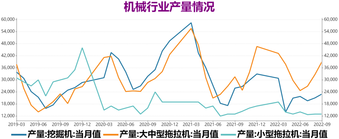 机械行业好坏参半。机械行业方面,根据国家统计局数据显示,2022年9月全国挖掘机产量为23024台,同比下降18.5%。2022年1-9月全国挖掘机产量231416台,同比下降22.1%。我国挖掘机累计产量同比降幅已连续四个月收窄。拖拉机方面,9月大中小型拖拉机产量分别为12678台、26538台、1.3万台, 同比分别增长30.8%、增长23.4%、保持不变。1-9月大中小型拖拉机累计产量分别为84175台、225503台、12.4万台,同比分别增长13.7%、下降4.8%、下降13.9%。9月机械行业环比整体有所好转,因9月开始进入工程机械行业的传统旺季,季节性效应开始显现。但是9月机械行业同比表现则好坏参半,其中大中型拖拉机产量同比大幅增加,小型拖拉机同比基本持平,而挖掘机同比依然有较大降幅。整体来看,国内稳增长政策带动下,机械行业产量出现一定改善,不过目前累计同比降幅还是比较明显,并且未来政策端进一步的拉动作用也存在不确定性。