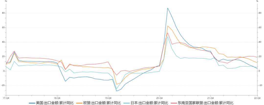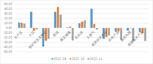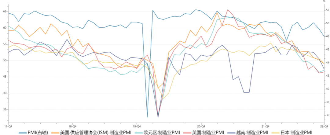 从出口经济体看, 中国对多个国家出口增速均有所下降,且降幅较为明显。11月我国对美国、欧盟出口同比增速分别为-25.4%和-10.6%,较10月分别回落12.8、1.6个百分点;而对东盟出口增速回落15.1个百分点至5.2%;对日本出口增速亦回落9.4个百分点至-5.6%。值得注意的是,此前我国对东盟出口增速始终维持在20%以上的水平,是我国第一大贸易伙伴,但随着受全球衰退预期升温影响较大,拖累整体出口增速较前月下行2.2个百分点。东盟经济并不能与各发达经济体区分出来,在全球经济压力下行的前提下,内外需共同承压。