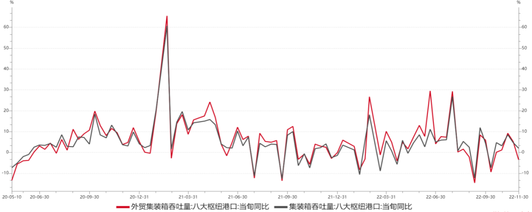 截至11月30日,八大枢纽港口集装箱吞吐量及外贸集装箱吞吐量同比分别较上月下降4.7和6.5个百分点。数据上看,八大枢纽港口集装箱吞吐量回落趋势仍在维持。随着全球经济衰退预期升温,内外需共同走弱,或导致出口对中国经济内生增速的拉动作用将进一步弱化。