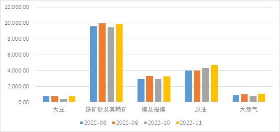 11月份,我国(美元计价)进口金额同比增速从 10月的-0.7%下滑至-10.6%,低于市场预期约3.5%,反映内需还在筑底阶段。从主要进口产品来看,原油、农产品和成品油等产品对进口同比拉动较大。其中,11月中国原油进口数量同比增速较上月下降2.3个百分点至11,8%,由于原油价格下跌,原油进口金额同比从10月的43.8%回落至28.1%。尽管量价均有所回落,但原油仍是对我国进口同比形成明显支撑的产品。此外,铁矿砂及其精矿、煤及褐煤、原油和集成电路等产品进口数量同比下滑,形成对11月进口较大拖累,但受到国内房地产融资支持力度加大的影响,部分上游原料进口金额受到原材料涨价的推动,铁矿砂及其精矿的进口金额同比跌幅从上月的26.79%收窄至22.38%,但其进口数量同比从10月的3.7%下滑至11月的-5.8%。受疫情反复扰动影响以及房地产持续走弱影响,国内需求始终呈现相对弱势,因而11 月进口同比增速持续大幅下滑。