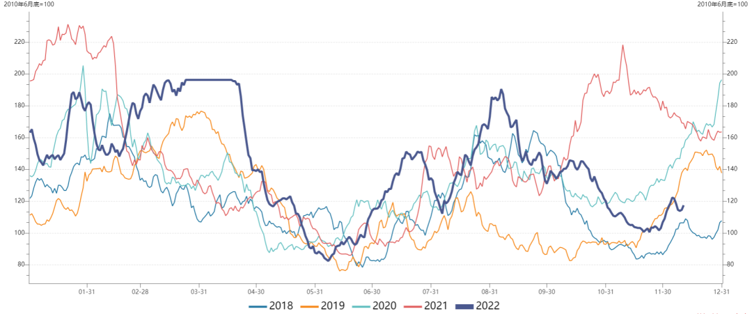 11月来受国内疫情、季节性因素及去年同期对比基数走高等共同影响,CPI食品项价格多数回落,带动CPI回落。PPI方面,主要工业品涨跌幅均相对较小,同比涨幅的回落主要受制于去年同期基数高。而地产相关方面,虽然 “政策底”已现,但政策效果仍需一段时间方才体现,目前来看始终维持较低景气度。