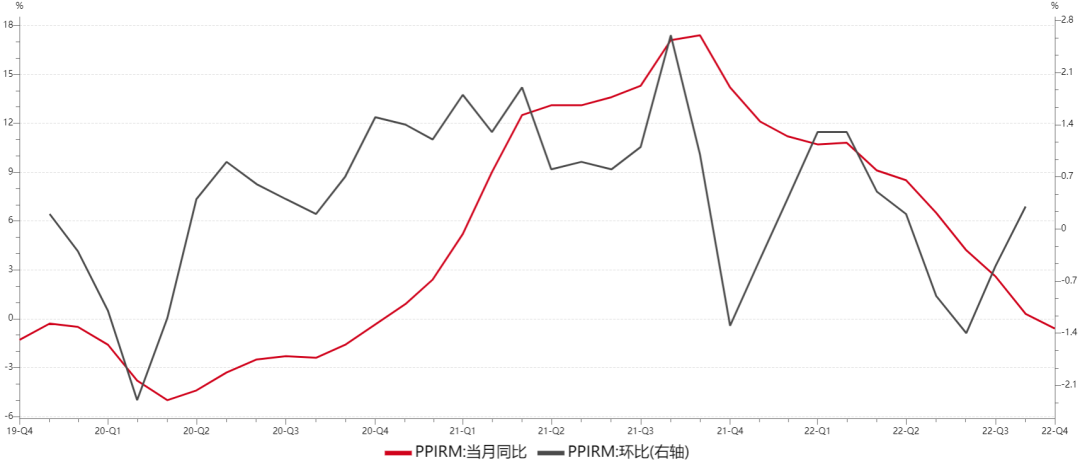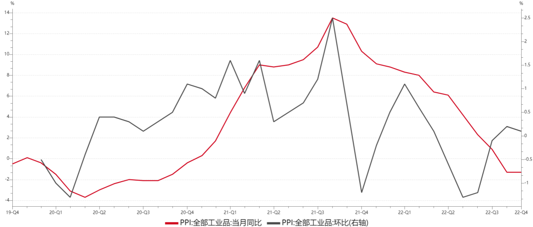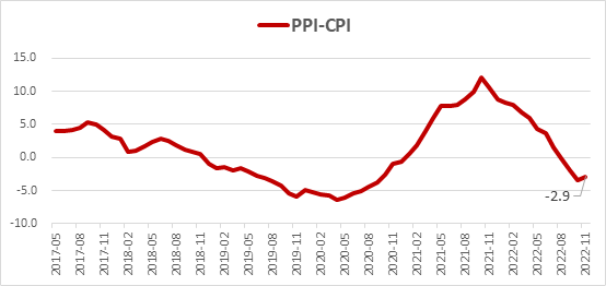 中国11月PPI同比继续下降1.3%,与上月持平;从环比看,11月PPI上涨0.1%,涨幅比上月回落0.1个百分点。生产资料放缓趋势有所改善,但由于去年高基数的影响,同比下降2.3%,降幅有所收缩,环比由上涨0.1%转为持平。石油相关行业价格受国际定价影响由降转升;煤炭行业价格保供稳价影响下涨幅有所回落;而受地产低迷影响,黑色金属采选业、冶炼及压延加工业环比继续下行且降幅进一步扩大。生活资料同比上涨2.0%,环上涨0.1%,涨幅均有所缩窄。从细分类别来看,食品、衣着、一般日用品、耐用消费品不论是同比或是环比增速,均有所回落。可以看出,通胀压力持续减弱,但通胀并不是越低越好,PPI的持续下滑也说明了目前内外需求不足,而在全球经济步入衰退的环境下,未来PPI或将进一步放缓。