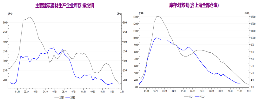 从数据显示,2022年螺纹钢产量仅小幅高于2021年,却明显低于2020及2019年同期水平,随着春节假期临近,螺纹钢产量大幅提产可能性较低,同时市场预期后市房地产市场将逐步回暖,且将增加建筑钢材需求,因此螺纹钢供应压力不大。