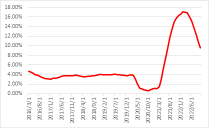 核心商品价格在本月加速回落,环比增速录得-0.5%;其中二手车和卡车环比增速录得-2.9%,跌幅再次扩大,而新车价格环比增长则录得0%,较前值0.4%也有所回落。服装及烟草产品价格环比增速分别录得0.2%及0.7%,较前值均有所上调,然而相对权重对CPI影响较小,从整体来看商品需求在经济逐渐疲软的情况下走弱趋势愈加明显。紧缩的货币政策对经济的负面影响将逐渐加重,未来需求水平大概率进一步受到抑制,同时全球供应链问题也正持续好转,核心商品价格在后继或保持下行趋势。