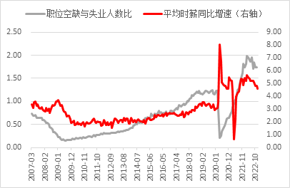 失业率在12月录得3.5%,较前值3.6%有所下降,且低于预期的3.7%,12月劳动参与率录得62.3%,较前值62.2%小幅上升且高于预期的62.2%。即便劳动参与率在本月有所好转,但与疫情前水平仍有较大差距。如11月非农就业数据点评中提到的问题一样,当前美国老龄人口劳动参与率恢复动能较弱且青壮年人口恢复空间已相对饱和,因此劳动力参与率在短期内仍难以大幅改善,美联储或仍将专注于抑制劳动力市场需求来减小劳动力缺口。劳动力市场需求方面,11月JOLTS职位空缺数录得1045.8万人,虽较前值1051.2万人有所下降,但仍远高于市场预期的1005万人。细分行业来看,服务业整体需求仍旧强劲;教育和保健服务、专业和商业服务及住宿休闲业职位空缺数在11月分别录得209万、202.6万及151.9万人,整体服务业劳动力需求尚未出现明显减弱趋势。