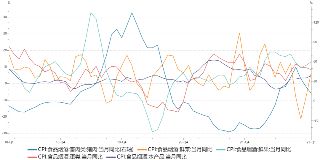 从非食品项看,1月环比增速由上月下降0.2%转为上涨0.3%,影响CPI上涨约0.25个百分点。其中,随着疫情防控政策优化调整,出行和文娱消费需求大幅增加,飞机票、交通工具租赁费、电影及演出票、旅游价格分别上涨20.3%、13.0%、10.7%和9.3%;受节前务工人员返乡及服务需求增加影响,家政服务、宠物服务、车辆修理与保养、美发等价格均有上涨;而受国际油价波动影响,国内汽油和柴油价格分别下降2.4%和2.6%。与去年相比,疫情及油价下跌共致非食品价格同比表现不佳,消费总体水平偏弱;但从环比增速来看,疫情措施优化的逐步落实,使得居民出行及娱乐需求大幅升温,且趋势稳固,后续随着内需的持续改善,核心CPI或走出低迷。