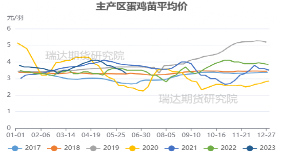 现阶段来看,市场对后市蛋鸡存栏增加的预期主要来自于2-4月补栏量的大增,然而自五一节日过后终端需求转淡,现货价格也从高位持续回落,截止目前蛋价甚至比21年以及22年同期略有偏低。蛋价下跌养殖利润收缩,补栏积极性降低,同时伴随着老鸡淘汰情绪升温。从周度淘汰量上看,自5月起,老鸡淘汰量较前期明显增加,也明显高于21和22年同期(2020年由于疫情影响,淘汰数据略有失真)。从历年鸡蛋现价季节性走势来看,一直到7月上旬蛋价走势仍将偏弱,继续驱动老鸡淘汰进程加快,蛋鸡存栏增幅有望不及预期。同时,从蛋鸡苗的价格走势来看,截至2023-06-09,主产区平均价:蛋鸡苗报3.3元/羽,蛋鸡苗价格连续回落,表明市场补栏积极性持续降低,限制远期蛋鸡存栏增量。对期货市场有所利好。