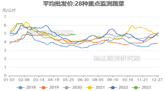 对于蔬菜而言,价格本应随着上市种类增加而季节性回落,但今年价格明显大幅高于往年同期。蔬菜价格较好,提升人们对于蛋价的接受程度,鸡蛋的替代效应增强。