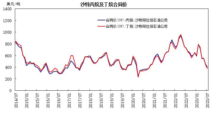 沙特阿美公布7月份CP合同价,丙烷报400美元/吨,较上月下跌50美元/吨,跌幅为11.1%;丁烷报375美元/吨,较上月下跌65美元/吨,跌幅为14.8%。折合到岸美金成本,丙烷455美元/吨,丁烷414美元/吨;折合人民币到岸成本,丙烷约合3614元/吨,丁烷约合3289元/吨左右。截至6月28日,8月份沙特CP预估价,丙烷报428美元/吨,较7月上调28美元/吨;丁烷报403美元/吨,较7月上调28美元/吨。9月份沙特CP预估价,丙烷442美元/吨,较8月上调14美元/吨;丁烷417美元/吨,较8月上调11美元/吨。远期CP预估小幅上调。国际液化气现货供需宽松下,7月沙特CP合同价跌幅高于预期;欧美地区丁烷需求表现疲软,而中国丙烷化工需求增长,导致国际丁烷跌幅大于丙烷,丙丁烷价差扩大至25美元/吨。进口气成本继续下行,打击现货市场情绪且拉低市场心理价位。图1:沙特丙烷及丁烷合同价