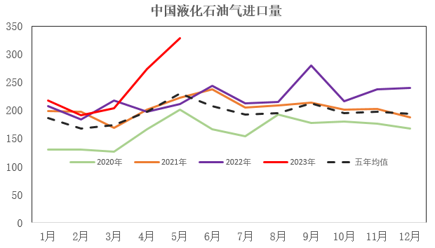 国家统计局公布的数据显示,5月液化石油气产量为452.1万吨,同比增长6.4%。1-5月液化石油气累计产量为2127.8万吨,同比增长5.2%。山东省液化石油气累计产量为485.3万吨,同比增长10.9%;浙江省液化石油气累计产量为502.5万吨,同比增长10.8%;广东省液化石油气累计产量为220.9万吨,同比增长5.9%。海关总署数据显示,5月液化石油气进口量为328.37万吨,同比增长55.2%;其中,液化丙烷进口量为254.94万吨,同比增长61%,进口均价为598.89美元/吨,同比下跌32.2%;液化丁烷进口量为73.42万吨,同比增长37.9%,进口均价为589.07美元/吨,同比下跌33.9%。1-5月液化石油气累计进口量为1214.06万吨,同比增长19.3%;其中,液化丙烷累计进口量为967.74万吨,同比增长18.8%;液化丁烷累计进口量为246.27万吨,同比增长21.5%。5月液化石油气进口量创出记录新高,丙烷进口量触及255万吨的高位;国内产量也刷新纪录高点,整体供应处于高位水平。图2:中国液化石油气进口量