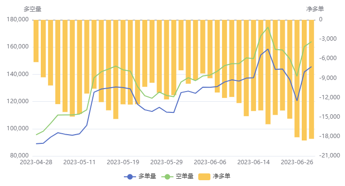 需求方面,6月以来,全国多地迎来高温天气,部分地区打破历史同期高温极值纪录;燃烧需求进入淡季,民用气终端消耗能力下降;此外,夏季燃气安全事故多发,各地安全监管严格抑制下游采购热情,业者多按需谨慎采购。化工需求方面,据隆众资讯统计,截至6月22日当周,烷基化油全国有外销工厂产能利用率在 47.2%左右;MTBE装置开工率在 60.5%左右;烷烃方面,全国 12 家异丁烷脱氢装置开工率为 87.8%左右,6 家混合烷烃脱氢装置开工率为78.3%左右;23 套丙烷脱氢(PDH)装置开工率在 79%左右。由于原料成本降至低位,深加工企业利润可观,PDH企业开工积极性较好。4、LPG净空持仓增加
