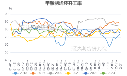 下游需求表现整体不及上游供应。其中,甲醇最大的下游烯烃行业开工大幅低于历史同期,1—6月烯烃产量仅有630万吨,低于去年同期4.38%。截至7月13日,国内MTO装置开工率75.5%,环比回落0.85%。6月中下旬,兴兴装置停车后,沿海烯烃市场主要利空兑现,华东地区的外采烯烃需求处于历史同期低位。7月份市场传闻兴兴大量外采甲醇,盛虹同样采购部分进口船货,以及宝丰三期MTO装置三季度有开车预期,综合导致市场对于MTO需求预期增强,目前消息还未证实,但市场表现已经在反应烯烃需求回升的预期,后续继续关注装置的动态,若兴兴重启消息证实,预计转为供需平衡,后期需要关注实际兑现情况。