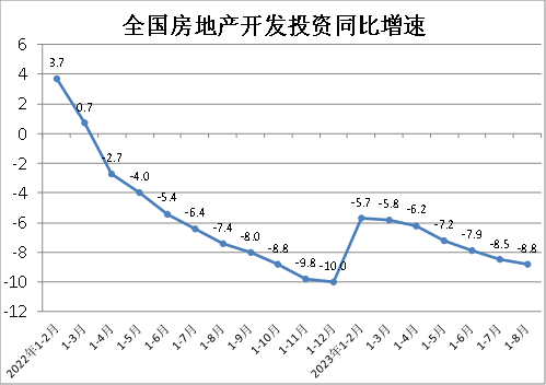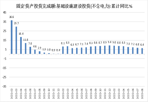 2023年1-8月份,基础设施投资(不含电力、热力、燃气及水生产和供应业)同比增长6.4%。其中,铁路运输业投资增长23.4%,水利管理业投资增长4.8%,道路运输业投资增长1.9%,公共设施管理业投资下降0.6%。整体上,市场寄于厚望的基建投资增速重心也是在逐步下滑。
