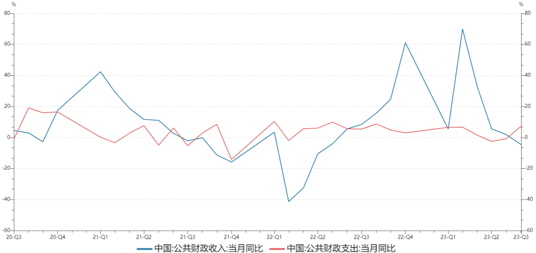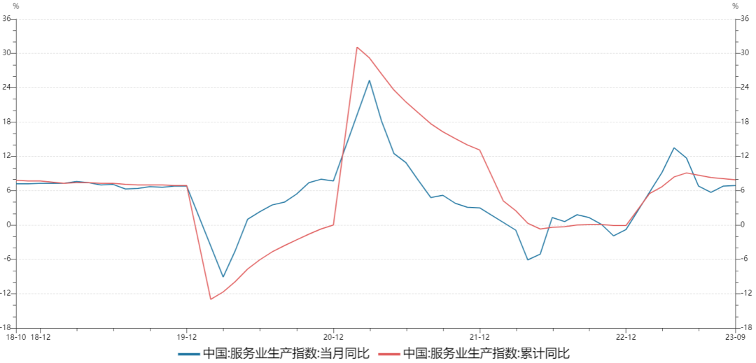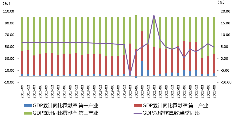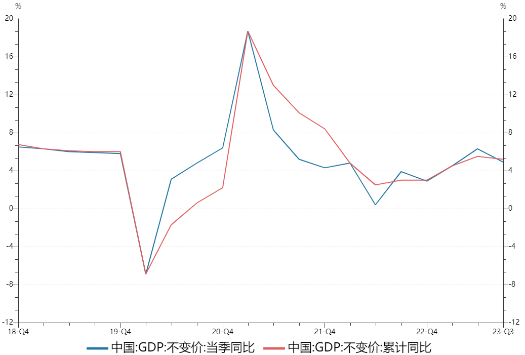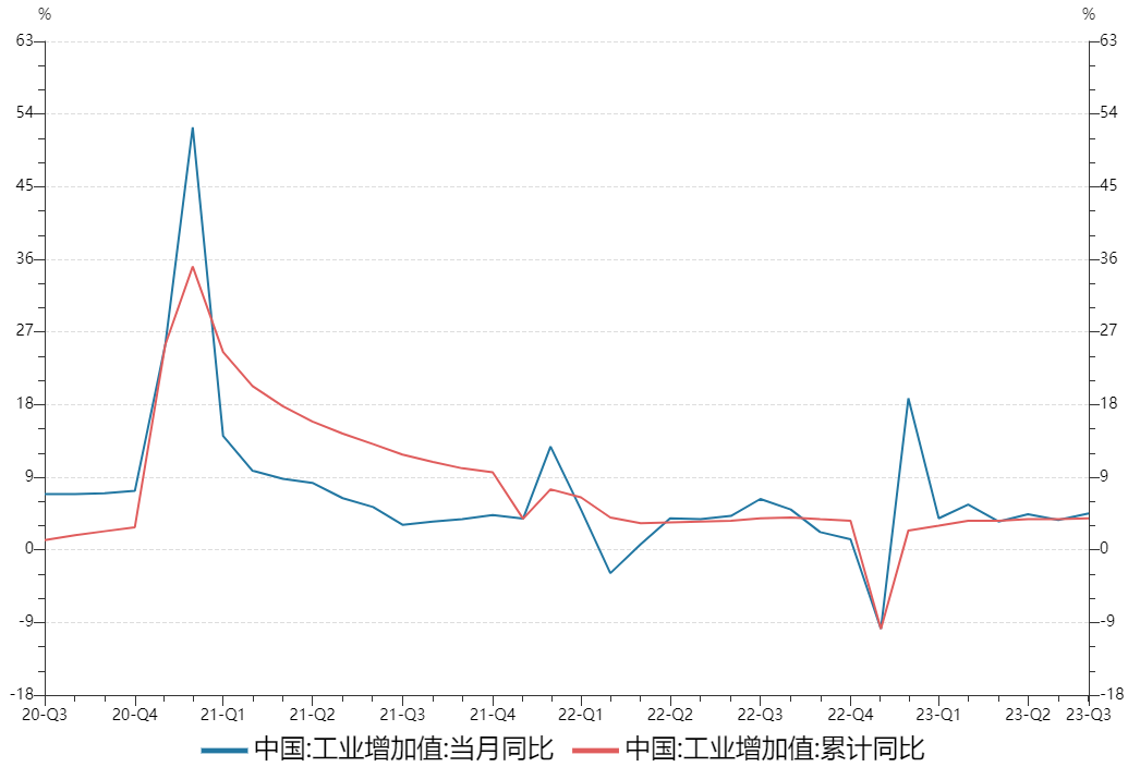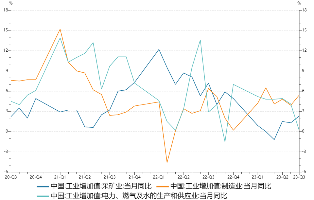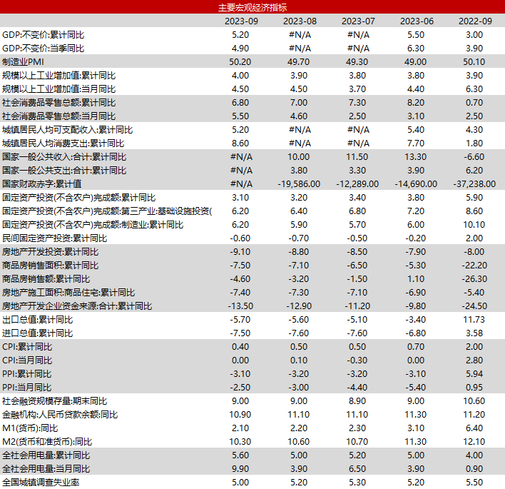 2023年10月18日,国家统计局公布数据,我国第三季度GDP同比增长4.9%,前值6.3%,预期4.4%。9月份我国规模以上工业增加值同比增长4.5%,前值4.5%,预期4.3%。固定资产投资同比增长3.1%,前值3.2%,预期3.2%。其中,基础设施投资增长6.2%,制造业投资增长6.2%,房地产开发投资下降9.1%。社会消费品零售总额同比增长5.5%,前值4.6%,预期4.9%。全国城镇调查失业率为5%,小幅回落。