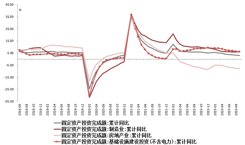 固投表现偏弱。前三季度我国固定资产投资同比增长3.1%,较上月回落0.3个百分点,基本符合预期。本月三项分类同比仅制造业有所回升,投资端在房地产景气度依旧偏弱的背景下总体承压。其中,民间投资累计同比下降0.6%,降幅小幅缩窄,但远低于疫情前水平,企业信心不足,对未来市场发展仍有担忧。