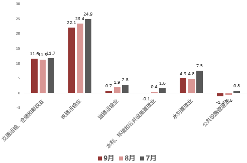 政府专项债加速发行,基建企稳回升。基建投资增长6.2%,较上月小幅回落0.2%,但从单月来看,同比增长6.8%,较上月回升0.6个百分点,主要受益于地方专项债加速发行。铁路运输业延续此前较快增长的态势,为主要贡献项。截止9月,我国专项债发行已超过今年政策目标%,推动基建行业运行,同时伴随着相关政策积极出台,基建资金端和项目端压力得到改善。