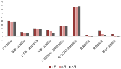 9月全国规模以上工业增加值增长4.5%,与上月持平;环比增长0.36%,工业生产增速保持平稳。分行业来看,原材料制造业增加值贡献亮点,同比增速持续高位运行。其中,化学原料及化学制品、黑色金属冶炼及压延加工、电气机械及器材制造业同比分别为13.4%、9.9%、11.5%,前值分别为14.8%、14.5%、10.2%。而在暑期旅游出行需求增加的背景下,服务业增加值同比增长6.0%,食品饮料、交通运输生产指数较上月上升较多,这也与需求端边际恢复相印证。9月工业产销率显著回升,意味着工业减产对于供需格局的优化更加有效。经济基本面的逐渐恢复,对原材料行业的拉动作用增强,使得相关生产增速加快。展望未来,稳增长措施频频落地,政策底已现,降息降准也将逐步反应到经济上,工业生产料继续改善。