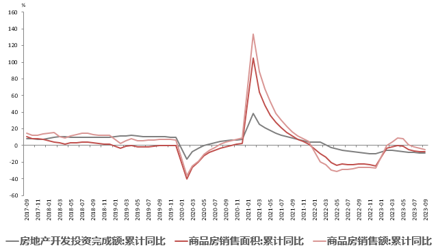 房地产开发投资同比降幅从上月的8.8%进一步扩大至9.1%,多项指标如销售额、销售面积、新开工偏弱运行,居民购房需求显不足、地产需求仍待企稳。具体来看,房地产新开工、施工和竣工面积累计同比增速略微好转,但弱于历史均值。而从需求端来看,9月商品房销售面积累计同比降幅进一步下行0.4个百分比至-7.5%,居民信贷端的改善仍需一定时间才能传导至投资端。