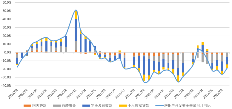 从地产资金来源看,自筹资金仍是主要拖累。9月份个人按揭贷款同比下降6.9%,大幅转弱,销售回款能力恶化,且自筹资金同比仍在-21.8%的低位徘徊。