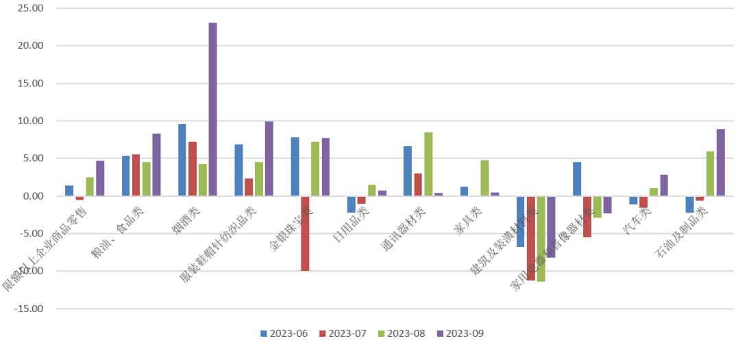 同时,商品类消费在本月同样延续增长进程,较服务消费增幅略小。9月份,商品零售额同比增长4.7%,增速较上个月回升2.3个百分点。从商品类别看,基本生活类商品销售大部分保持正增长,其中饮料及烟酒消费弹性释放,穿类以及部分升级类商品零售增势较好,如服装鞋帽纺织品类、金银珠宝类分别同比增长9.9%和7.7%,。受地产低景气拖累,地产后周期消费品如建筑装潢和家用电器器材类增速一直维持在负值区间。