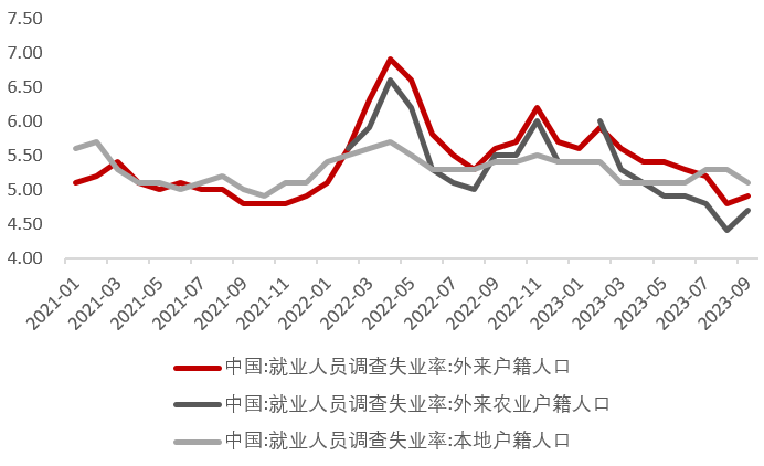 从就业角度和收入来看,前三季度居民收入实际增长5.9%。就业形势较上月继续改善,9月全国城镇调查失业率较上月下降0.2个百分点至5%,连续两个月下降。前三季度,全国城镇调查失业率平均值为5.3%。但值得注意的是,9月份农民工失业率在上行,这部分人群的消费的持续性有待观察。随着各地新一轮特殊再融资债陆续发行,部分资金将用于偿还项目拖欠款,后续关注资金落地对于农民工收入和相关就业对消费需求的拉动作用。