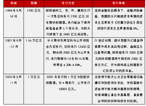 同时,调节预算、发行特别国债意味着中央政府明确加杠杆并释放强烈的稳增长稳预期信号,也进一步打开了后续政策想象空间。值得注意的是,此次增发国债不仅是仅有的第四次年中增发国债,同时在四季度进行预算调整并不常见。回顾历史,我国共有三次发行特殊国债,均有特别目的。