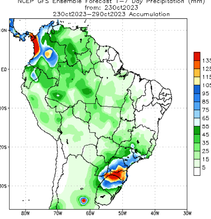 厄尔尼诺现象通常会给巴西南部地区带来大雨,北方天气干旱,中西部降雨分布不均。中西部也是巴西主要的大豆和玉米产区。事实上,厄尔尼诺现象的影响已经显现,因为南部地区降雨过多,而中西部和北部地区仍然只有零星降雨。在大豆和玉米播种本应势头强劲之际,有报道称作物播种推迟。由于干旱,亚马逊河水位已降至一个多世纪以来最低水平。