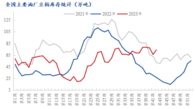 从国内的情况来看,随着十一过去,国内油厂开机水平大幅回升,豆粕产出增加,但下游提货补库一般,国内豆粕库存有所回升。10 月 20 日,国内主要油厂豆粕库存 79 万吨,周环比增加 7 万吨,月环比减少 5 万吨,同比增加 53 万吨,比过去三年同期均值增加 23 万吨,仍处于历史同期高位水平。