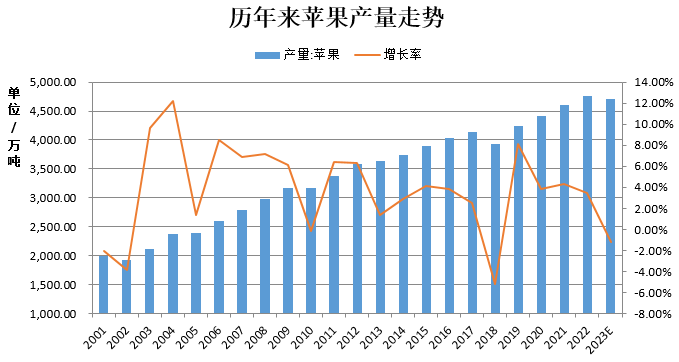 新产季而言,据中国果品流通协会,基于没有极端天气影响的天气情况下,预计2023产季苹果总产量与去年基本持平。产区来看,陕西苹果在花期虽然遭受低温、多雨、冰雹等灾害天气,但不同产区受影响差异较大,基本对北部产区苹果影响较小,加上新果园挂果面积较大,预计陕西省苹果产量预计与去年持平。山东产区苹果产量较去年微幅减少,其中蓬莱、莱州等地区苹果有所减产。另外结合市场各方调研,综合来看,今年苹果树遭遇伐树量较少,产量出现下滑有限,多数产区增产为主,结合我的农产品网和卓创调研预估,预计2023年苹果产量较上年减少1%左右,整体基本与去年变化不大。据国家统计局知,2022年全国苹果产量为4757.13万吨,同比减少3.48%,2023年苹果产量预估值在4700万吨。