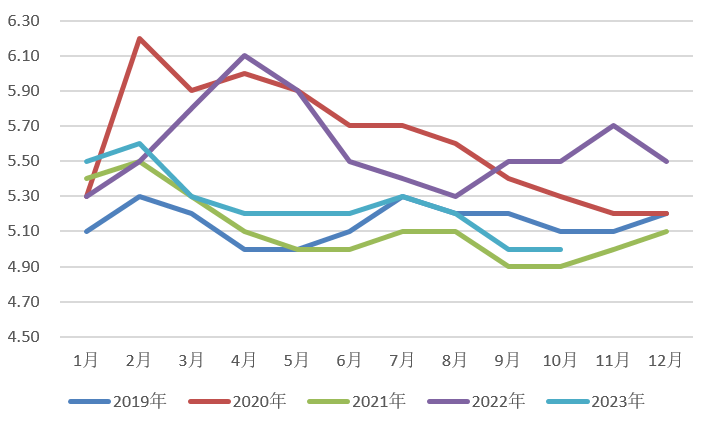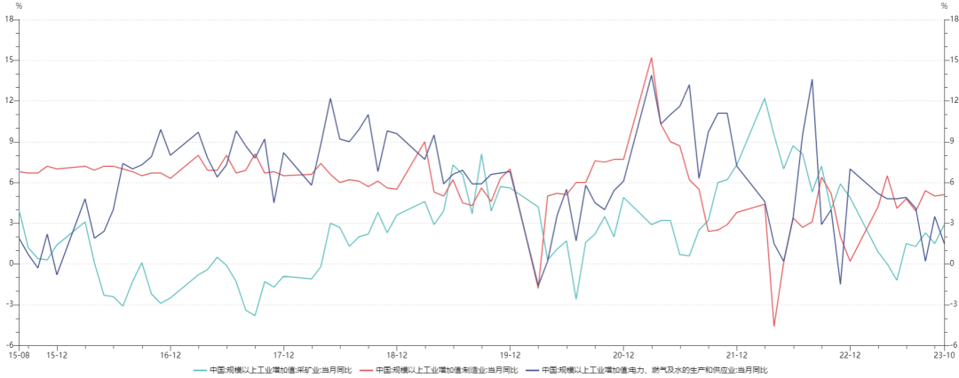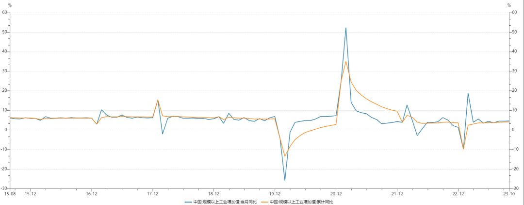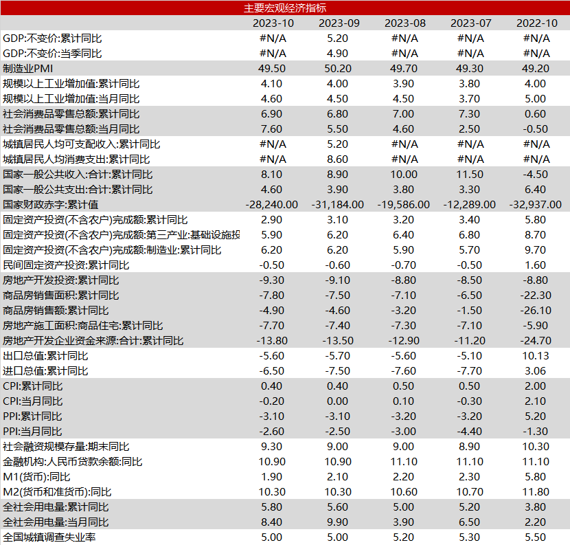 2023年11月15日,国家统计局公布数据,10月份我国规模以上工业增加值同比增长4.6%,前值4.5%,预期4.3%。固定资产投资同比增长2.9%,前值3.1%,预期3.1%。其中,基础设施投资增长5.9%,制造业投资增长6.2%,房地产开发投资下降9.3%。社会消费品零售总额同比增长7.6%,前值5.5%,预期7.0%。全国城镇调查失业率为5%。