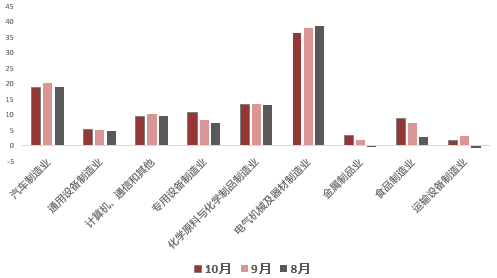 制造业结构未发生较大变化,依旧是以电气机械及器材和汽车制造业为主,高技术制造业增速远高于整体。其中,高技术制造业和高技术服务业投资分别增长11.3%、10.5%。高技术制造业中,航空、航天器及设备制造业,医疗仪器设备及仪器仪表制造业投资分别增长19.0%、16.7%。本月制造业PMI重返收缩区间,也印证了生产经营活动稳定,而需求略显疲弱。